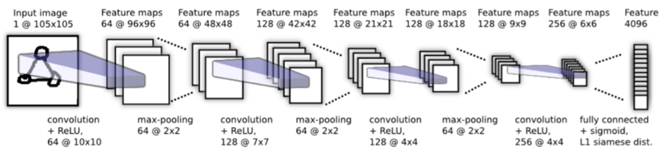 Siamese networks는 내부에 두 개의 sub network가 존재한다. input image가 pair로 존재하기 때문에 각각의 이미지를 sub network에 넣어 output 두 개를 만들고 두 output을 통해 distance를 산출한다. 이 때 두 sub networks의 parameters는 공유된다. 샴 네트워크(Siamese networks)는 symmetric 하기 때문에 (A, B)의 산출 값과 (B, A)의 산출 값이 같아야 한다. 따라서 논문에서는 feature vector h1, h2 사이에 L1 distance를 계산하고 activation function으로 sigmoid를 사용하여 0과 1사이로 output을 낸다. (0: different, 1: same) 따라서 이때 loss function은 binary cross-entropy를 사용한다.
