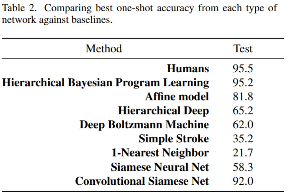 Test 결과를 보면 HBPL이 가장 훌륭한 성능을 보이고 있으나 HBPL은 알파벳의 획 순서, 방향 등과 같은 추가적인 정보를 가지고 있지만 Convolutional Siamse Net은 extra 정보 없이 92%의 성능을 달성한다.