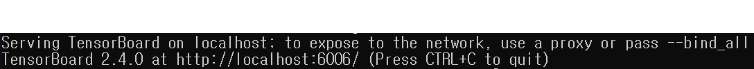 그러면 아래와 같이 화면이 실행되는 것을 알 수 있는데 화면에 보이는 주소(http://localhost:6006/)을%EC%9D%84) 복사해서 인터넷 주소창에 입력하면 log 기록을 볼 수 있다. 주소는 사람마다 다를 수 있다.