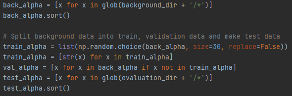 back_alpha에는 40개의 class가 들어있고 그곳에서 랜덤으로 30개를 골라 train_alpha에 넣어주고, val_alpha는 back_alpha중 train_alpha에 없는 class를 골라 넣어줍니다. test_alpha는 제공되는 데이터 그대로 사용합니다.