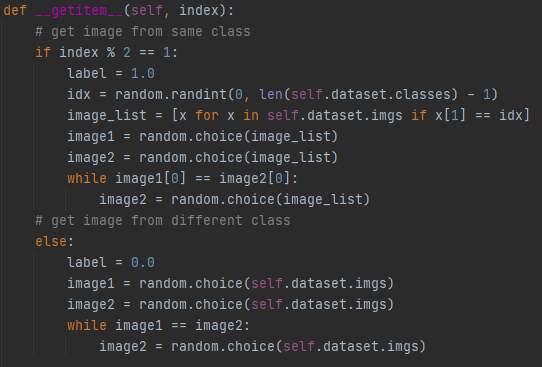 50% 비율로 same, different를 만들어야 해서 index가 짝수, 홀수 일 때로 나누어 코드를 작성했는데, index가 홀수일 때는 서로 같은 class에서 이미지는 가져오고 index가 짝수일 때는 서로 다른 class에서 이미지를 가져올 수 있도록 하였습니다. 사용되는 self.dataset은 이전에 만들어 놓았던 train 폴더입니다.