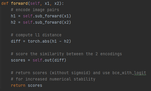 forward에서는 두 개의 이미지를 각각 sub forward를 거치게 하여 feature vector를 만들고 둘의 차이를 l1 distance로 계산합니다. 그리고 그 계산 값을 다시 linear layer를 거치게 하는데 원래는 마지막에 sigmoid를 통과시켜서 결과를 내야 하지만 pytorch에는 BCEWithLogitsLoss라는 loss fuction을 활용하기 위해 마지막은 sigmoid 연산을 해주지 않습니다. (BCEWithLogitsLoss는 자동으로 sigmoid를 하기 때문에 모델의 마지막에 sigmoid를 해주면 안돼요!)
