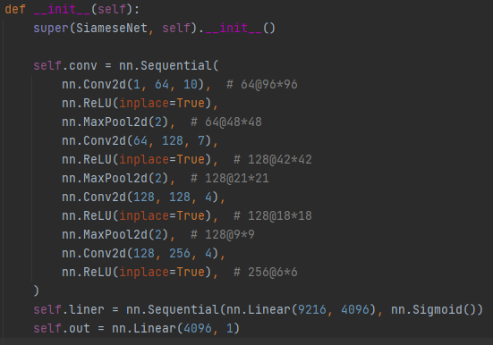 Siamese network의 구조는 간단합니다. 4번의 conv layer(self.conv)를 거치고 flatten layer(self.linear)와 feature vector의 similarity를 만들어주는 layer(self.out) 만들어주면 되는데 sub_forward가 존재하는 게 차이점입니다. 보통은 forward 한 번으로 끝나지만 siamese networks는 두 개의 이미지를 weight을 공유하는 module에 넣고 여기서 나온 feature vector를 가지고 다시 학습을 하기 때문에 두 개의 이미지를 encoding 하는 sub_forward가 필요합니다.