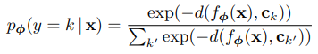 Distance function $d = \mathbb{R}^M \times \mathbb{R}^M \rightarrow (0, +\infty)$로 protonet은 embedding space에서의 prototype에 대한 distribution을 생성해 내는데 이 distribution은 distance로 softmax한 query point x의 class를 결정할 때 필요하다.