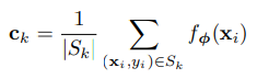 Protonet은 M-dimensional representation인 $c_k \in \mathbb{R}^M$ or $prototype$을 계산하고 각각의 class는 embedding function $f_\phi : \mathbb{R}^D \rightarrow \mathbb{R}^M$을 거친다. $\phi$는 learnable parameter(weight)이다. 각각의 prototype은 각 class에 속한 mean vector of the embedded support points이다.